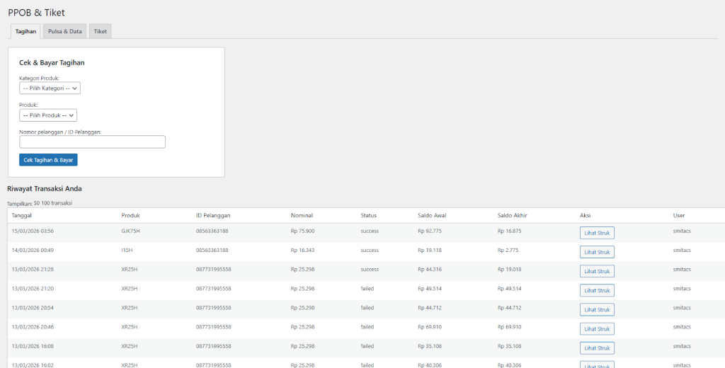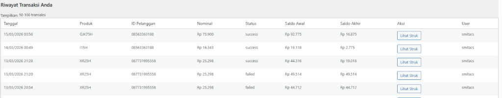Ini tabel Riwayat transaksi yang menjadi acuan Ketika selesai transaksi karena semua akan terekam disini sehingga apabila setelah tarnsaksi respon gagal maka cek dulu pada Riwayat transaksi bisa saja setelah itu menjadi sukse dan bisa mendownload struk