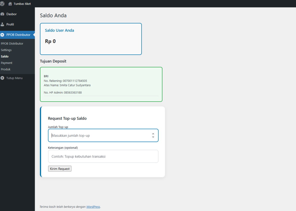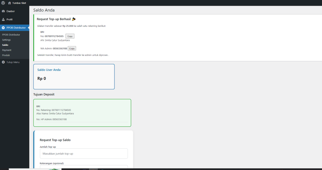 Untuk mengisi saldo deposit agar bisa melakukan tarnsaksi pada plugin (transaksi ini merupakan transaksi sendiri anda sebagai distributor atau age nata member anda pada website wordpress anda) yaitu pada kolom tambah saldo user masukkan nominal deposit lalu kirim deposit dan setelah transfer konfirmasi ke WA 08563363188, saldo yang ditransfer setelah disetujui akan masuk pada saldo ppob api.