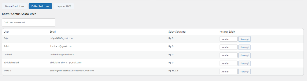 Selain itu pada menu saldo tedapat 3 tab yaitu tab Riwayat saldo user (sudah dijelaskan diatas), tab daftar saldo user dan laporan PPOB. Pada daftar saldo user ini anda bisa melakukan pengurangan saldo sesuai username terdaftar dan pengurangan bisa dilakukan karena anda sebagai admin dan bisa menyesuaikan jika terjadi selisih