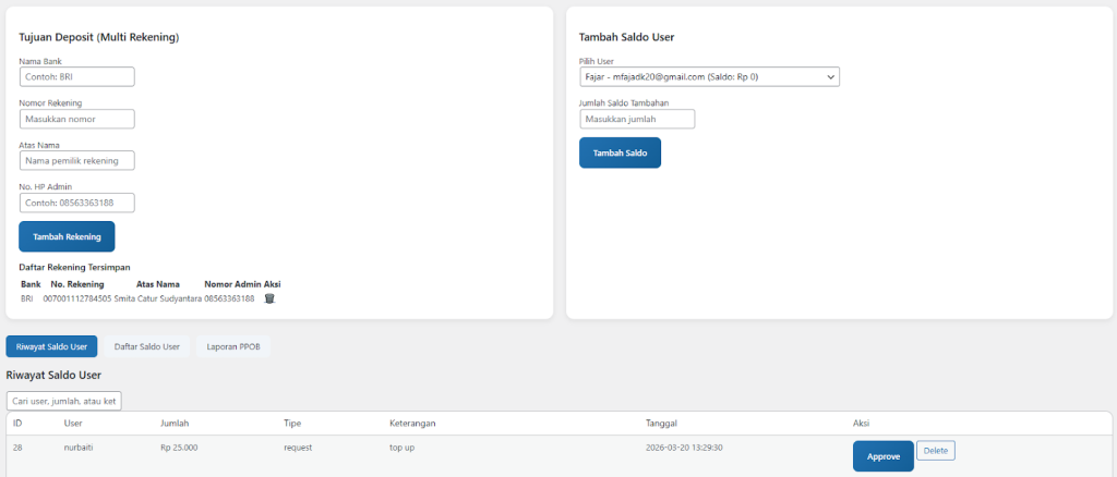Jika user member anda melakukan request toup saldo maka akan muncul pada tab Riwayat saldo user dan anda bisa klik approve atau tambah manual pada kolom tambah saldo user