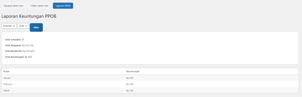 Lalu tab laporan ppob yang berisi semua laporan transaksi yang telah dilakukan